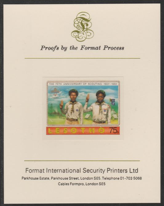 Lesotho 1982 75th Anniversary of Scouting- 75s Scouts Saluting,imperf mounted on Format International Proof Card, as SG478