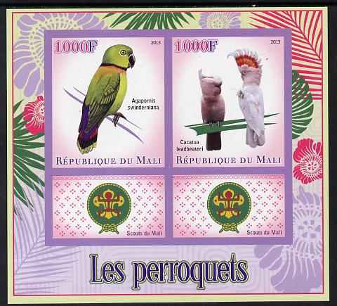 Mali 2013 Parrots imperf sheetlet containing two values & two labels showing Scouts Badge unmounted mint