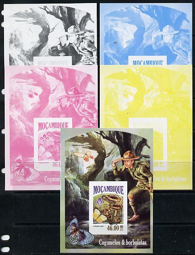 Mozambique 2013 Scouting & Butterflies #6 deluxe sheet - the set of 5 imperf progressive proofs comprising the 4 individual colours plus all 4-colour composite, unmounted mint