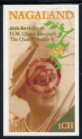 Nagaland 1985 Life & Times of HM Queen Mother imperf souvenir sheet (1ch value) with Girl Guide 75th Anniversary opt in red unmounted mint