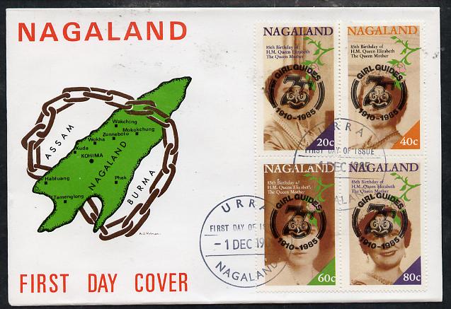 Nagaland 1985 Life & Times of HM Queen Mother perf set of 4 with Girl Guide 75th Anniversary opt in black, on cover with first day cancel