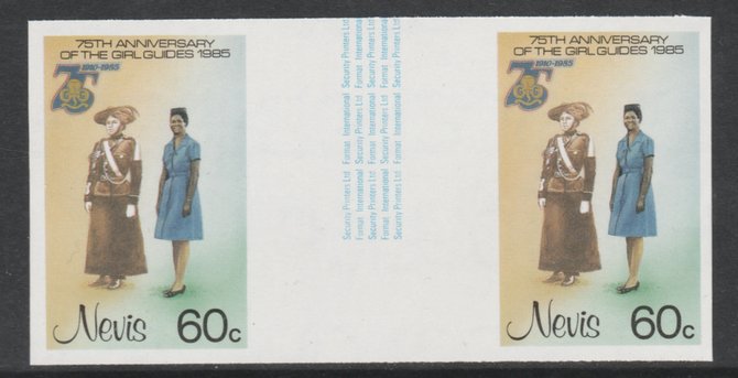 Nevis 1985 Girl Guides - Guides' Uniforms 60c imperf gutter pair (from uncut archive sheet) unmounted mint as SG 294. Note: The design within the gutter varies across the sheet, therefore, the one you receive,may differ from that ……Details Below