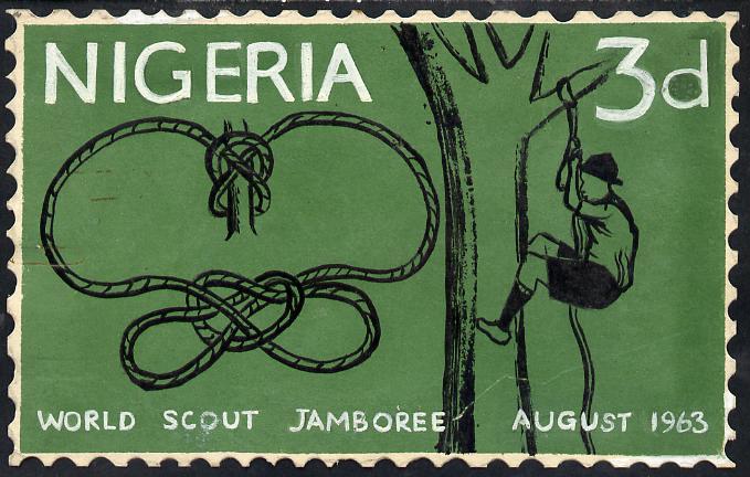 Nigeria 1963 11th World Scout Jamboree - original hand-painted artwork for 3d value (Scout climbing Tree & Knots) by unknown artist on card 6.5" x 4"