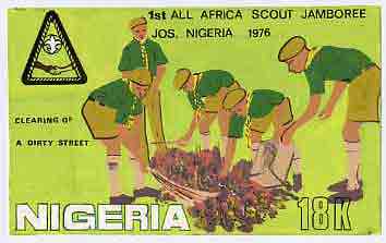 Nigeria 1977 First All Africa Scout Jamboree - original hand-painted artwork for 18k value (Street Cleaning) by unknown artist on card size 9.5"x6"