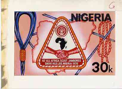 Nigeria 1977 First All-Africa Scout Jamboree - original hand-painted artwork for 30k value (Jamboree Emblem) by NSP&MCo Staff Artist Samuel A M Eluare on card 9" x 6" endorsed G