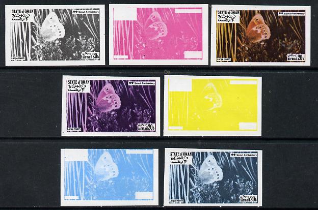 Oman 1974? Scout Anniversary - Butterflies 20b (Large Heath) set of 7 imperf progressive colour proofs comprising the 4 individual colours plus 2, 3 and all 4-colour composites unmounted mint