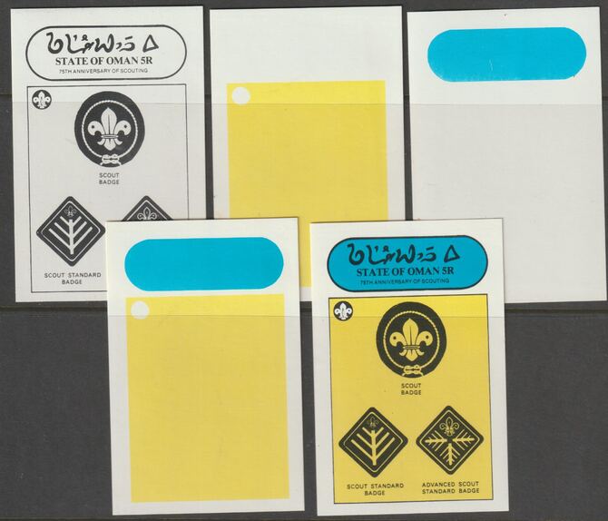 Oman 1982 75th Anniversary of Scouting imperf deluxe sheet (5R value) - the set of 5 imperf progressive proofs comprising 3 individual colours, 2 colour composite and all 3 colours as issued unmounted mint