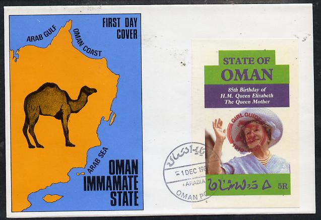 Oman 1985 Life & Times of HM Queen Mother imperf deluxe sheet (5R value) with Girl Guide 75th Anniversary opt in red, on cover with first day cancel