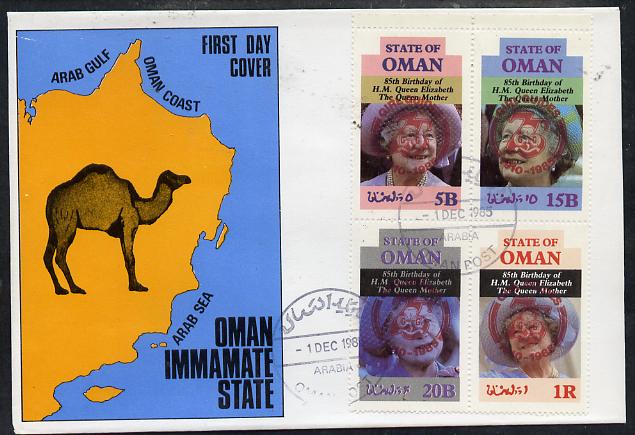 Oman 1985 Life & Times of HM Queen Mother perf set of 4 with Girl Guide 75th Anniversary opt in red, on cover with first day cancel