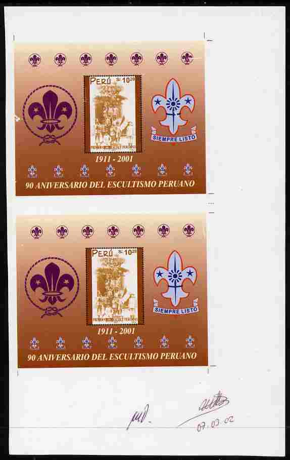 Peru 2001 90th Anniversary of Scouting proof sheet containing two imperf m/sheets (uncut) some surface marks but with approval signatures, unmounted mint