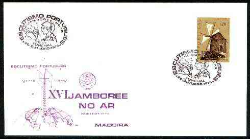 Portugal 1973 illustrated cover (Aerial & Globe) for 16th Madeira Scout Jamboree, 20c Windmill stamp with special cancel
