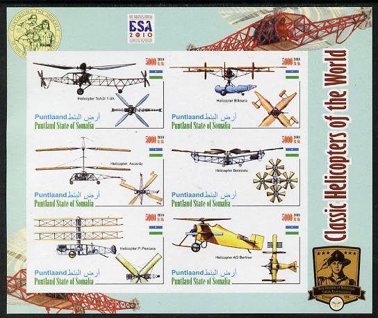 Puntland State of Somalia 2010 Helicopters of the World #2 imperf sheetlet containing 6 values with Scout Badges unmounted mint