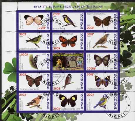 Rwanda 2009 Butterflies & Birds perf sheetlet containing 14 values plus label showing Baden Powell, fine cto used