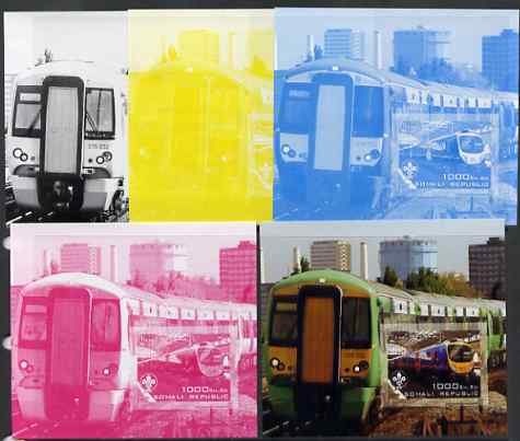 Somalia 2006 Modern Trains #4 souvenir sheet with Scout Logo, the set of 5 imperf progressive proofs comprising the 4 individual colours plus all 4-colour composite, unmounted mint