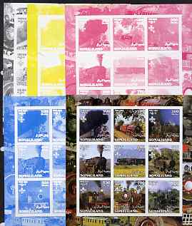 Somaliland 2002 Steam Trains #1 sheetlet containing set of 9 values each with Scout Logo - the set of 5 imperf progressive proofs comprising the 4 individual colours plus all 4-colour composite, unmounted mint
