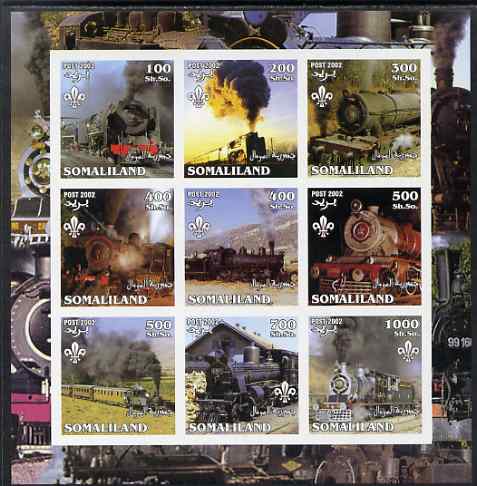 Somaliland 2002 Steam Trains #2 imperf sheetlet containing set of 9 values each with Scout Logo unmounted mint