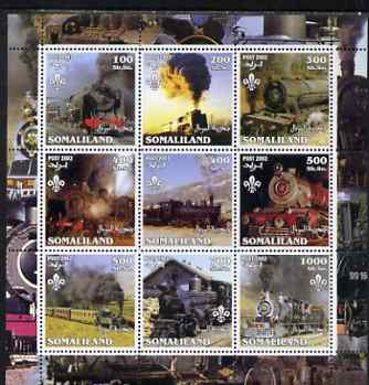 Somaliland 2002 Steam Trains #2 perf sheetlet containing set of 9 values each with Scout Logo unmounted mint