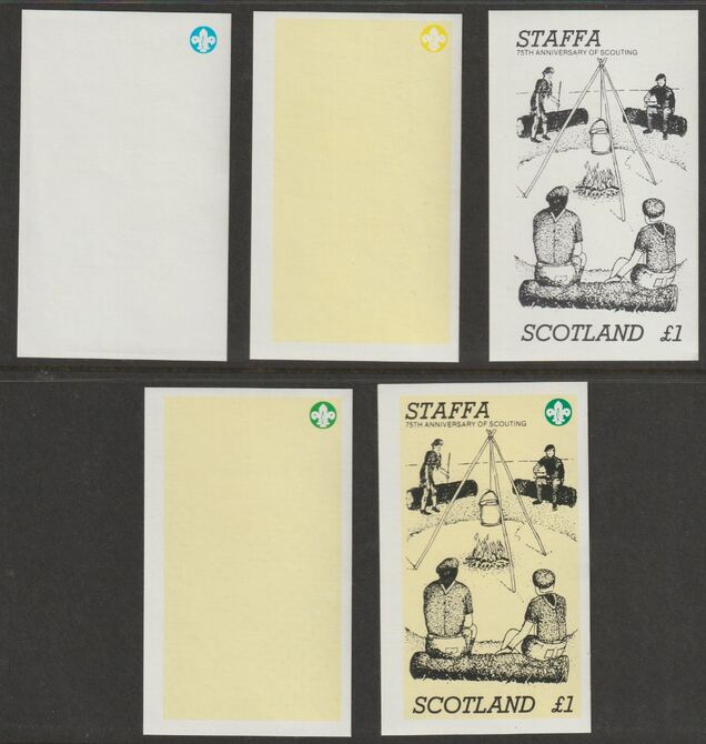 Staffa 1982 75th Anniversary of Scouting imperf souvenir sheet (£1 value) - the set of 5 imperf progressive proofs comprising 3 individual colours, 2 colour composite and all 3 colours as issued unmounted mint