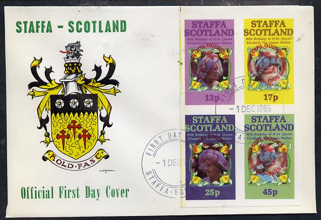 Staffa 1985 Life & Times of HM Queen Mother imperf set of 4 with Girl Guide 75th Anniversary opt in red, on cover with first day cancel