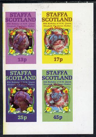 Staffa 1985 Life & Times of HM Queen Mother imperf set of 4 with Girl Guide 75th Anniversary opt in red unmounted mint