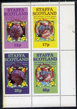 Staffa 1985 Life & Times of HM Queen Mother perf set of 4 with Girl Guide 75th Anniversary opt in red unmounted mint