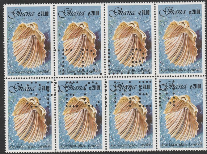 Ghana 1990 Seashells 20c Great Ribbed Cockle, superb block of 8 showing the full perfin 'T.D.L.R. SPECIMEN' (ex De La Rue archive sheet) rare, unusual and unmounted mint as SG 1417
