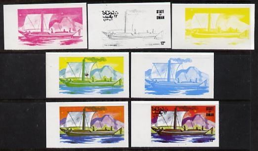 Oman 1977 Ships 12b (The Comet of 1812) set of 7 imperf progressive colour proofs comprising the 4 individual colours plus 2, 3 and all 4-colour composites unmounted mint