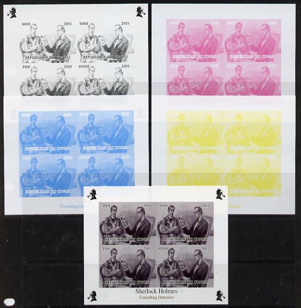 Congo 2013 Sherlock Holmes #2c sheetlet containing 4 vals (lower left design from sheet #2) - the set of 5 imperf progressive colour proofs comprising the 4 basic colours plus all 4-colour composite unmounted mint