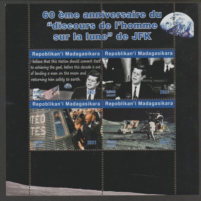 Madagascar 2021 60th Anniversary of JFK's Man on the Moon speech, #1 perf sheetlet containing 4 values unmounted mint. Note this item is privately produced and is offered purely on its thematic appeal