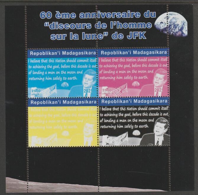 Madagascar 2021 60th Anniversary of JFK's Man on the Moon speech, #2 perf sheetlet containing 4 values unmounted mint. Note this item is privately produced and is offered purely on its thematic appeal