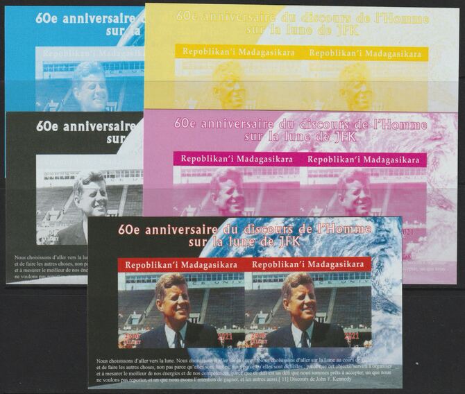 Madagascar 2021 60th Anniversary of Pres Kennedy,s Man on the Moon Speech #1 imperf sheetlet containing 2 values - the set of 5 imperf progressive proofs comprising the 4 individual colours plus all 4-colour composite, unmounted mint