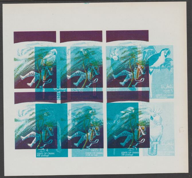 Oman 1970 Parrots sheetlet of 8 printed in blue only DOUBLY PRINTED with Space Achievements (Space Walk) sheet of 6 in blue, magenta & yellow, imperf on gummed paper - a spectacular and most unusual item unmounted mint