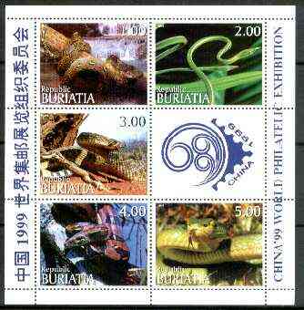 Buriatia Republic 1999 Snakes sheetlet containing 5 values plus label for China 99 Stamp Exhibition unmounted mint