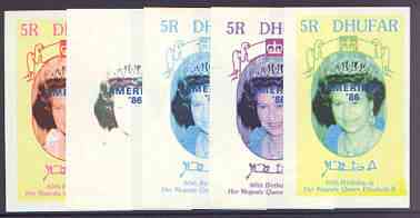 Dhufar 1986 Queen's 60th Birthday imperf deluxe sheet (5R value) with AMERIPEX opt in blue, set of 5 progressive proofs comprising single & various composite combinations unmounted mint