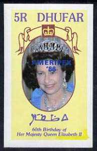 Dhufar 1986 Queen's 60th Birthday imperf deluxe sheet (5R value) with AMERIPEX opt in blue unmounted mint