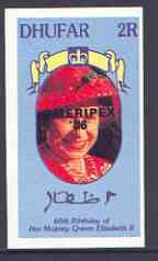Dhufar 1986 Queen's 60th Birthday imperf souvenir sheet (2R value) with AMERIPEX opt in black unmounted mint