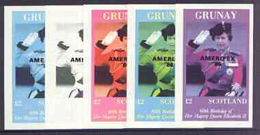 Grunay 1986 Queen's 60th Birthday imperf deluxe sheet (£2 value) with AMERIPEX opt in black, set of 5 progressive proofs comprising single & various composite combinations unmounted mint
