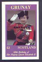 Grunay 1986 Queen's 60th Birthday imperf deluxe sheet (£2 value) with AMERIPEX opt in black unmounted mint
