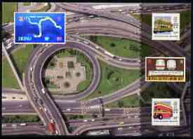 Hong Kong 1996 Hong Kong '97 Stamp Exhibition Hologram Postcard No 4 (Motorway Junction) showing $2 Mass Transit Railway stamp in hologram form plus reproductions of other Transport stamp designs, fine cto used