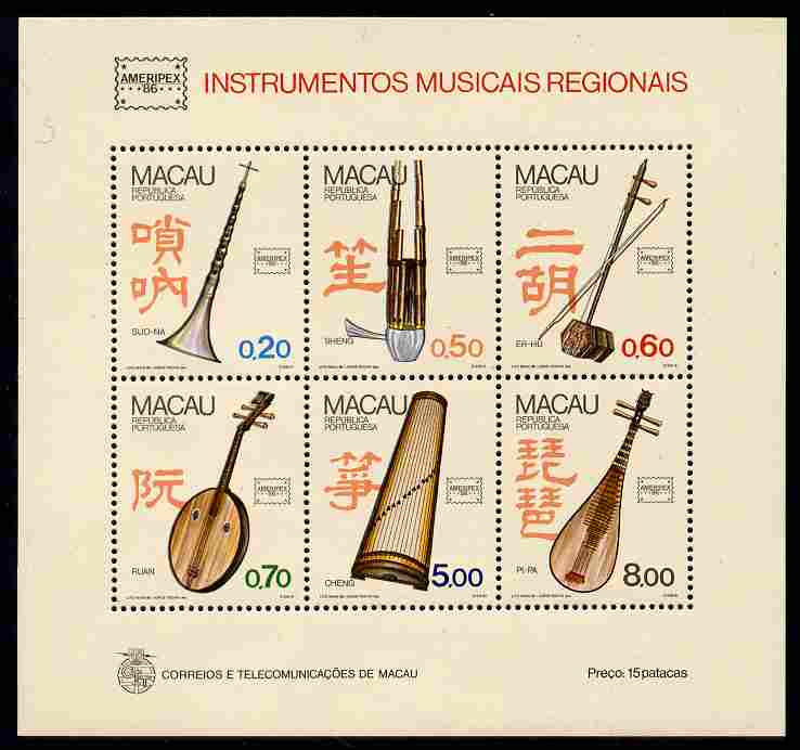 Macao 1986 Ameripex Stamp Exhibition - Musical Instruments perf m/sheet unmounted mint SG MS629