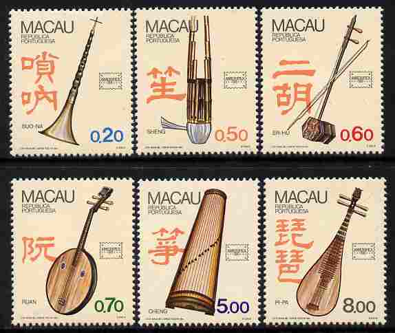 Macao 1986 Ameripex Stamp Exhibition - Musical Instruments perf set of 6 unmounted mint SG 623-28