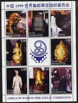 Mordovia Republic 1999 Antiquities perf sheetlet containing 8 values plus label for China 1999 Stamp Exhibition, unmounted mint
