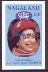 Nagaland 1986 Queen's 60th Birthday imperf deluxe sheet (2Ch value) with AMERIPEX opt in blue unmounted mint