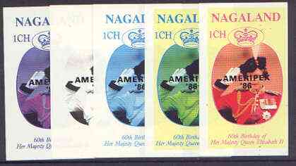 Nagaland 1986 Queen's 60th Birthday imperf souvenir sheet (1ch value) with AMERIPEX opt in black, set of 5 progressive proofs comprising single & various composite combinations unmounted mint