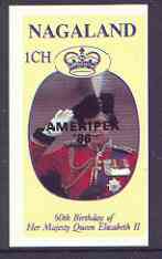 Nagaland 1986 Queen's 60th Birthday imperf souvenir sheet (1ch value) with AMERIPEX opt in black unmounted mint