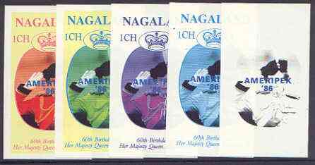 Nagaland 1986 Queen's 60th Birthday imperf souvenir sheet (1ch value) with AMERIPEX opt in blue, set of 5 progressive proofs comprising single & various composite combinations unmounted mint