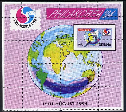Nigeria 1994 Philakorea Stamp Exhibition (Globe) misperforated m/sheet (wrong perforating comb used) unmounted mint