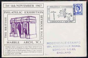 Postmark - Great Britain 1967 cover for Britsh Philatelic Exhibition (1st Day with Marble Arch in purple) with Mounted Postal Rider illustrated cancel (cover slightly grubby)