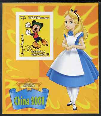 Somalia 2007 Disney - China 2008 Stamp Exhibition #09 imperf m/sheet featuring Micky Mouse & Alice in Wonderland overprinted with Olympic rings in gold foil, unmounted mint. Note this item is privately produced and is offered pure……Details Below