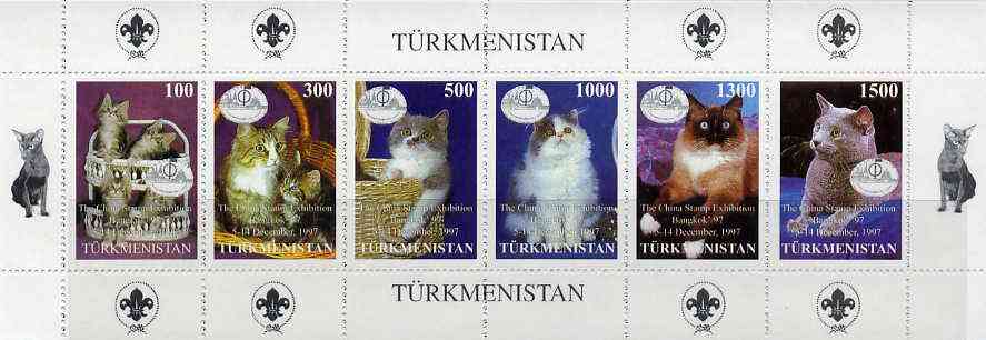 Turkmenistan 1997 Domestic Cats,sheetlet containing complete set of 6 values (with Scout Logo in margins)with China Stamp Exhibition imprint and logo